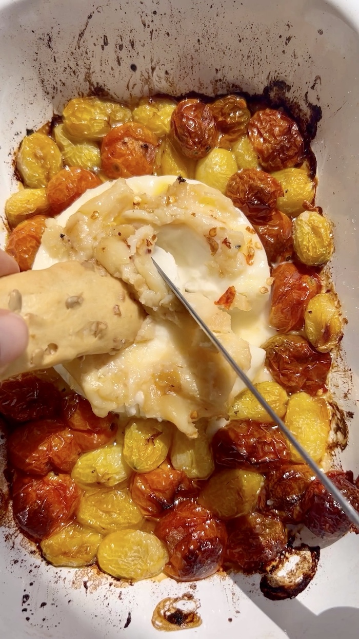 - Squeeze out the garlic from its skin and spread it on top of the cheese. Add pepper and chili flakes if you want a little kick, then drizzle with olive oil. Bake for 5 to 10 minutes until the cheese is soft. Grab some crackers and enjoy!