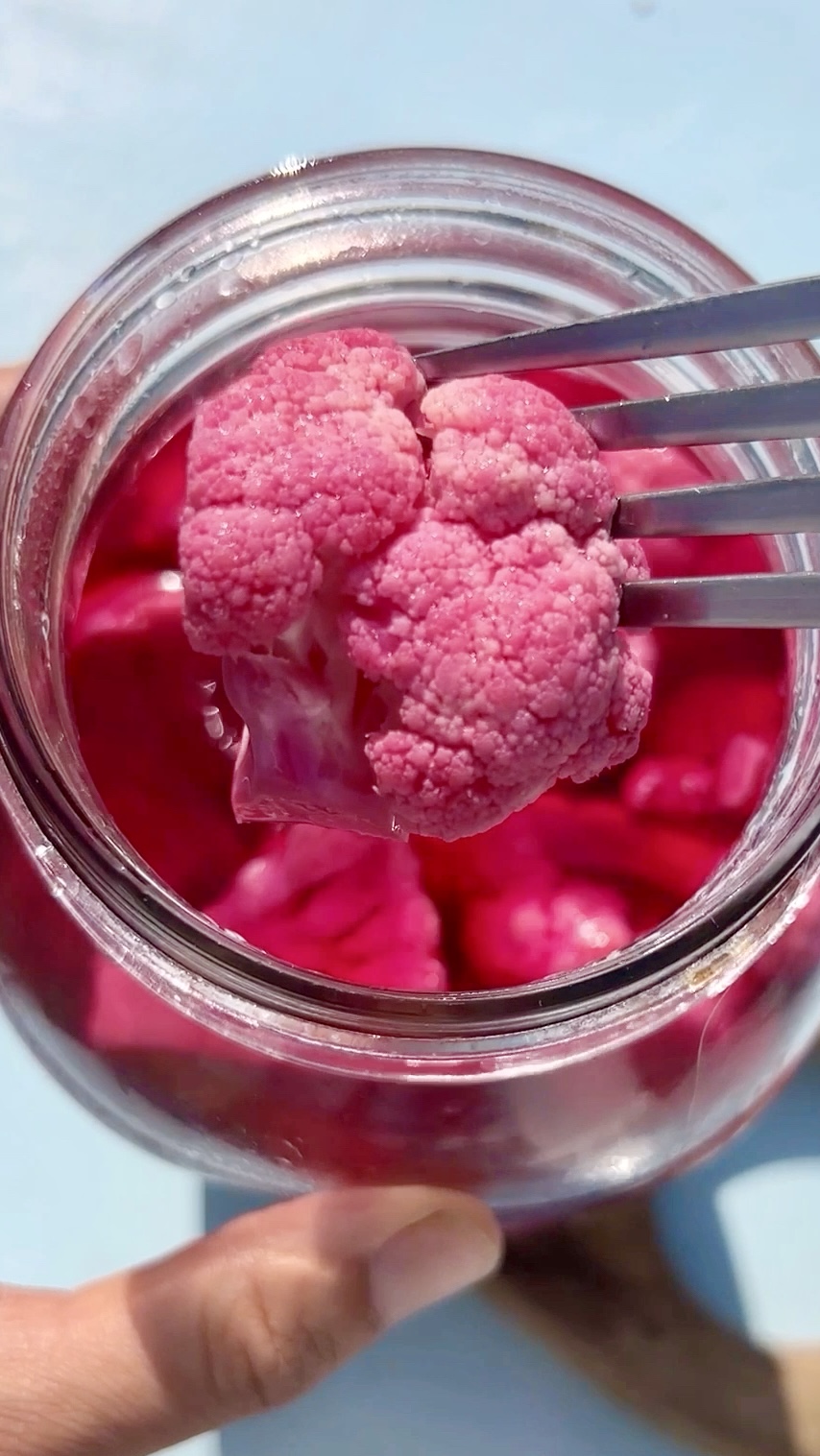 - If needed, top off with a bit more warm water or vinegar. Let the jar cool completely at room temperature, then seal and refrigerate. Allow the cauliflower to pickle for at least 4 days—by then, it should be fully pink and flavorful. Store in the fridge for up to 4 weeks, making sure the cauliflower remains covered with brine.