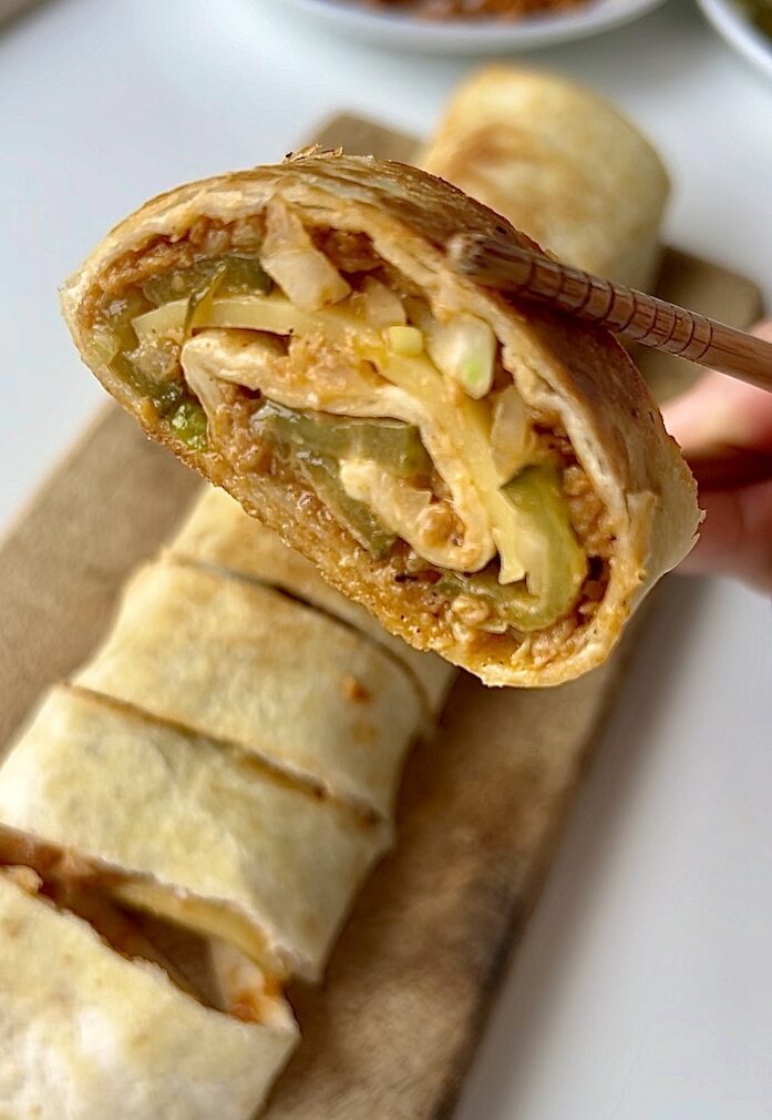 - Spread 2 tbsp of the sauce onto one large flour tortilla. Continue with the lettuce, vegan mince, onion, and pickles. Roll tightly.