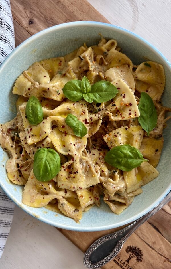 This creamy caramelized onion pasta is a simple yet flavorful comfort dish. Sweet, roasted onions and soft garlic are combined with soy cream, a hint of chili flakes, and fresh herbs go perfectly with your favorite pasta. No sugar or sweeteners are needed—the onions caramelize naturally, bringing out their rich, savory flavor.