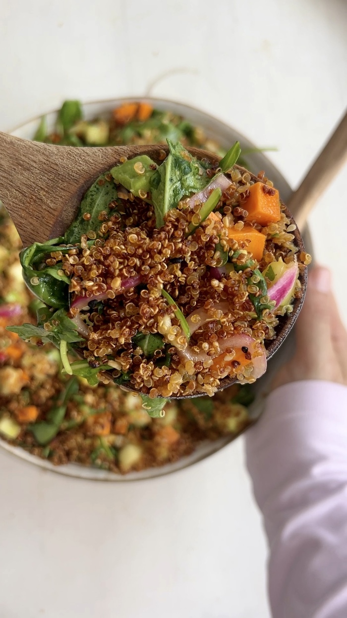 - Top with crispy quinoa, saving some for garnish. Pour over the dressing and mix well.