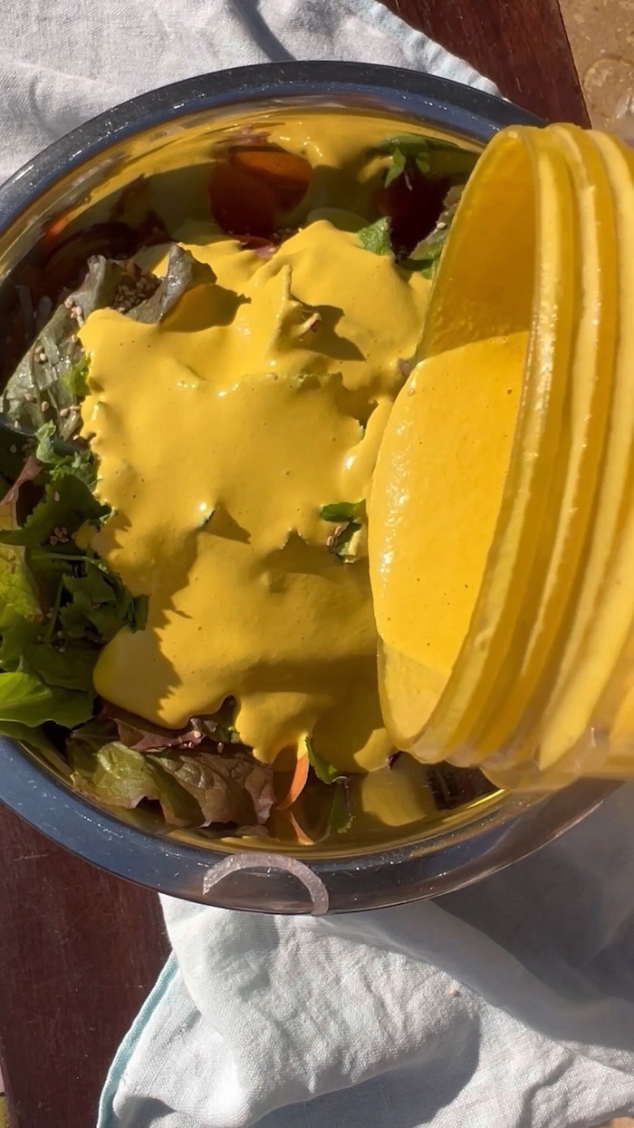This thick and creamy salad dressing I made with tahini, turmeric, ginger, and carrot. For the salad I used curried chickpeas and rainbow veggies. Feel free to use it for any salad you like.