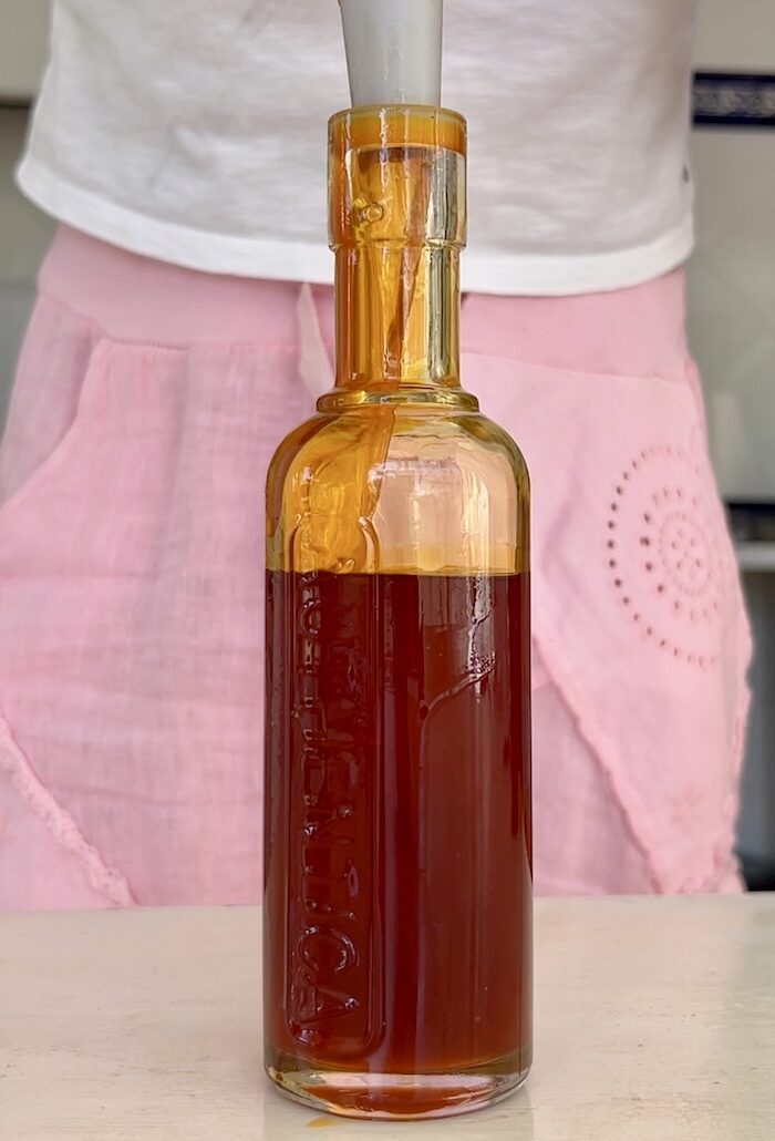 - Strain the oil through a fine sieve into a clean glass bottle using a funnel, or leave the chili flakes inside if you prefer a stronger flavor. Seal the bottle and store in a cool, dark place.