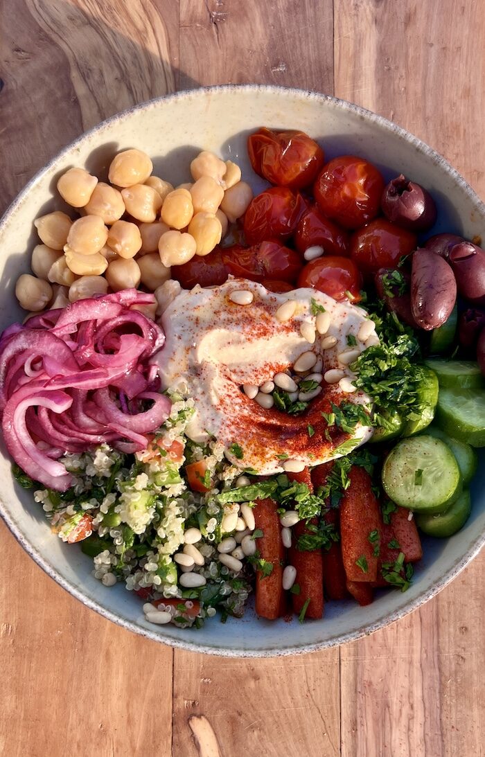 This hummus bowl is my go-to for a healthy, colorful, and satisfying meal. It's great for meal prep too! Creamy hummus sits in the center, surrounded by fresh quinoa tabbouleh, roasted carrots and cherry tomatoes, crunchy cucumbers, pickled red onions, chickpeas, and briny olives. Everything is finished with a drizzle of olive oil, a sprinkle of paprika, and fresh parsley. It’s simple to make, full of flavors and textures, and perfect with toasted sourdough on the side.