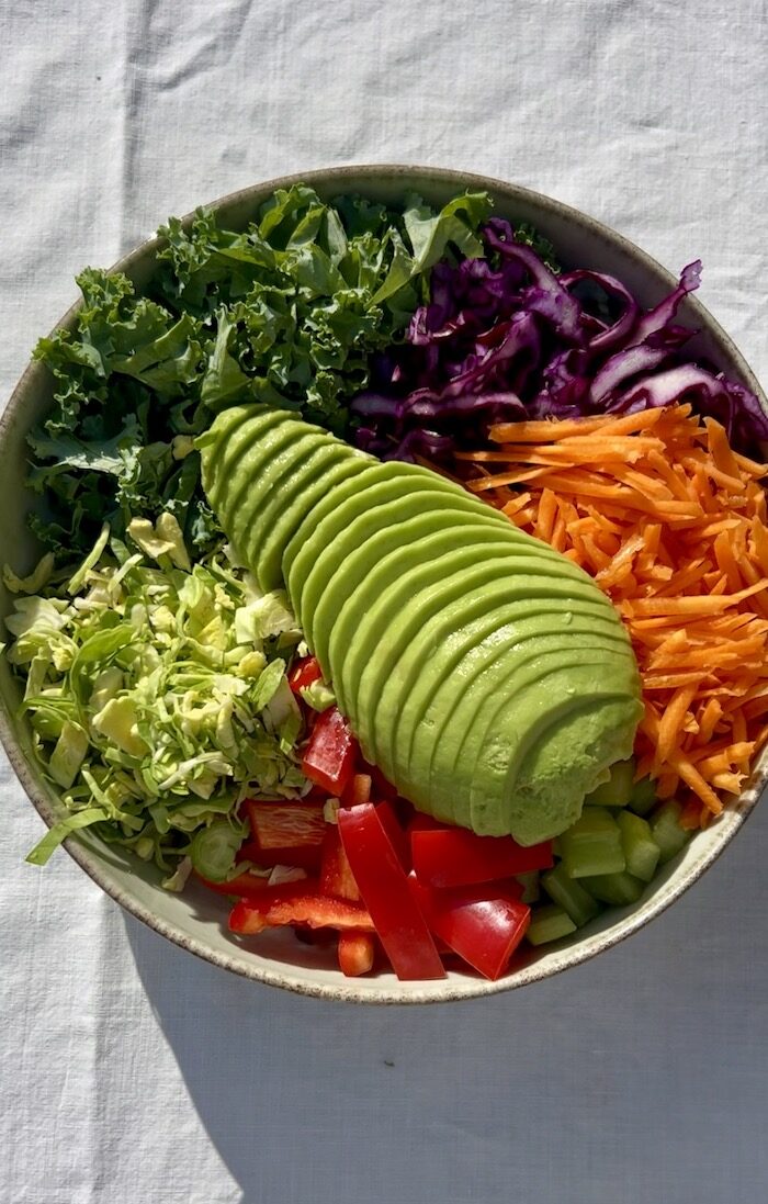 - Start by chopping, slicing, and grating your veggies. Assemble the kale, red cabbage, bell pepper, celery, brussels sprouts, and carrots directly in the serving bowl(s).