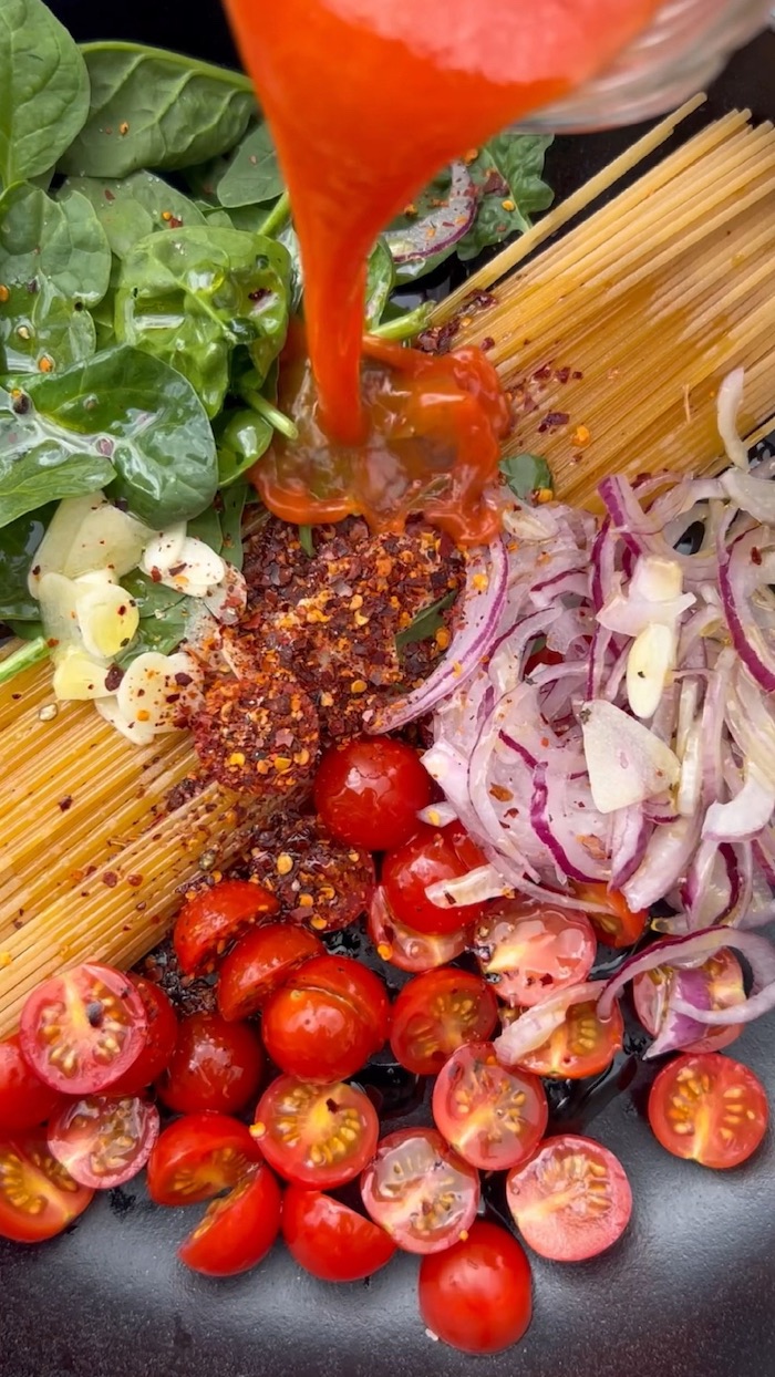 This version uses spaghetti, cherry tomatoes, and spinach for a fresh and colorful mix. A little onion, garlic, and chili flakes give depth and a gentle kick of heat. For the liquid, you can choose what you have on hand. Gazpacho adds richness, but water or tomato juice work just as well. When the pasta is tender and the liquid has reduced, you finish it with your favorite cheese. It can be vegan or not, depending on what you like.