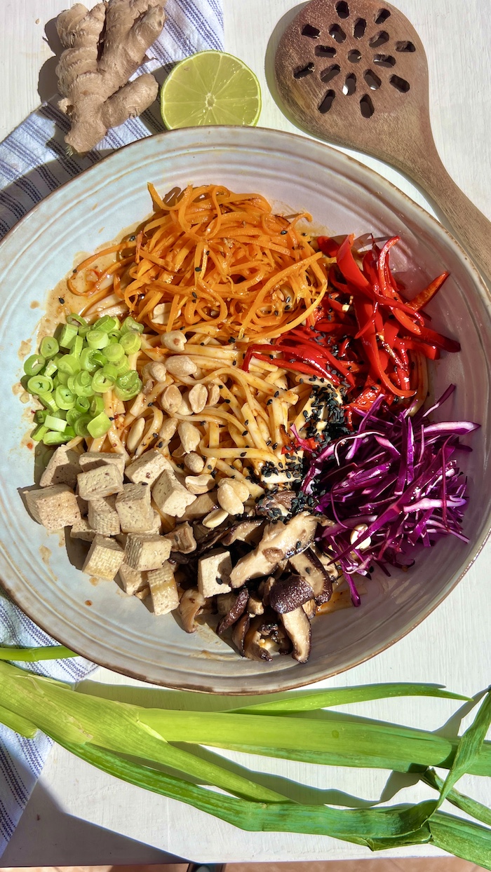 Next, add the toppings to make this peanut noodles recipe stand out. Crispy tofu cubes provide protein and texture. Roasted shiitake mushrooms add savory umami. Julienned carrots and red bell peppers are lightly sautéed for a tender-crisp bite. Shredded red cabbage adds color and crunch. Finally, garnish with chopped spring onion, crushed peanuts, and black sesame seeds for a visually appealing, flavorful bowl that is ready to serve.
