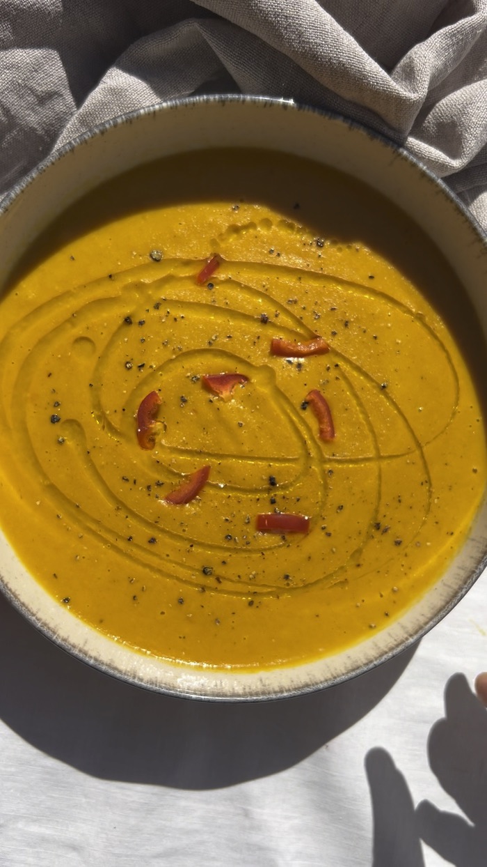 What makes this roasted carrot soup special is its balance of flavors and textures. The roasted carrots provide natural sweetness and body, while the ginger adds brightness and spice. Thai curry powder introduces aromatic notes that elevate the soup, creating a complex yet comforting taste. Blending the ingredients results in a smooth, velvety texture that’s satisfying and nourishing with every spoonful.