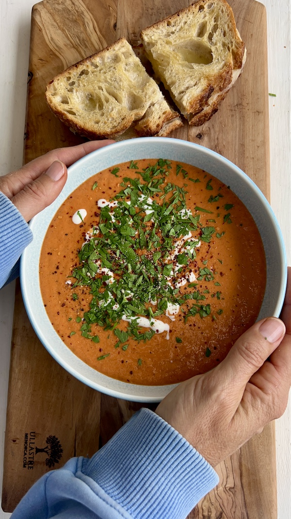 This roasted tomato soup is rich, cozy, and perfect for a fall or winter night. Slow-roasted tomatoes, bell peppers, and garlic with a hint of rosemary create a deep and rich flavor It’s simple, comforting, and makes about 600 ml — enough for two warm, satisfying bowls. Perfect with a grilled vegan cheese sandwich on the side. Feel free to double or even triple the recipe for more servings or meal prepping, and it freezes well too.