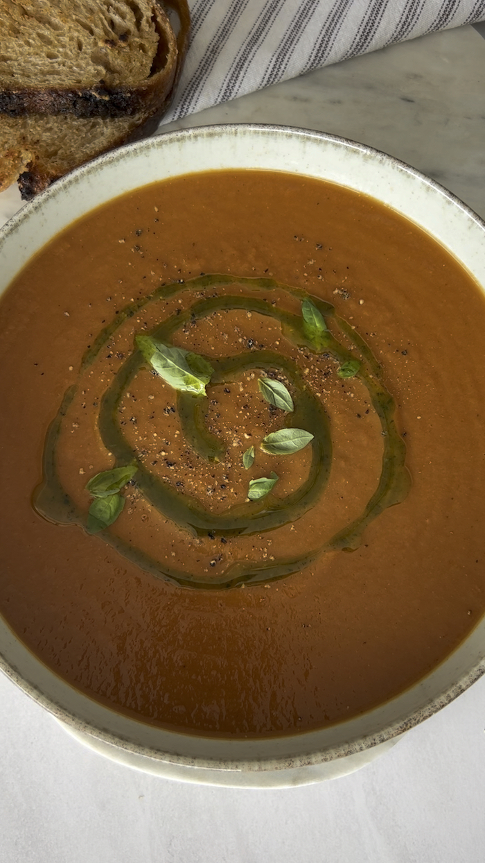 This roasted tomato soup recipe brings warmth, flavor, and comfort to any meal. First, slow-roast ripe tomatoes to enhance their natural sweetness and develop deep, smoky flavors. Then, add a small amount of roasted eggplant to create a creamy, smooth texture without overpowering the soup. Fresh herbs and a drizzle of olive oil enhance the taste, while basil adds a bright, aromatic finish.