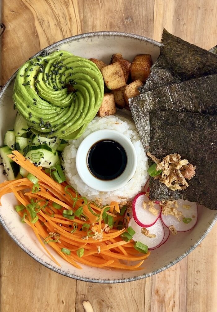 - Divide the sushi rice between two bowls. Arrange tofu, cucumber, carrot, radishes, and avocado on top.