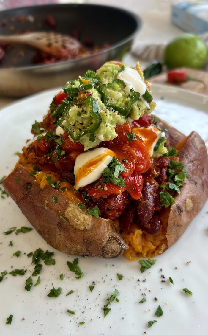- Garnish the stuffed sweet potatoes with chopped cilantro, jalapenos, hot sauce, cashew sour cream, and cracked pepper.