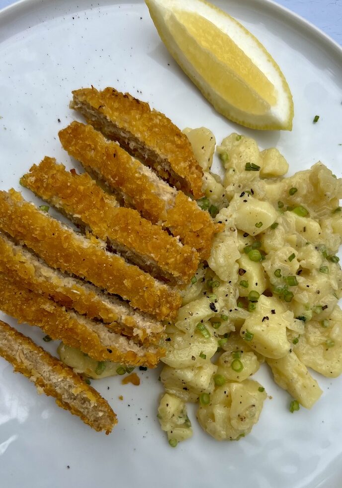 Today I tried a vegan version inspired by Austrian’s national dish. The typical potato salad is naturally vegan (if made with veggie broth) and made with a warm marinade of onion, oil, mustard, and vinegar. It’s also important to cook the potatoes with their peel. After peeling, slice them thinly and add them to the marinade while still warm. The plant-based Schnitzel is made from soy and is store-bought from Lidl. It’s really crispy, and quickly made in the air-fryer without adding any extra oil (around 10 minutes at 200 degrees C / 390 F).
