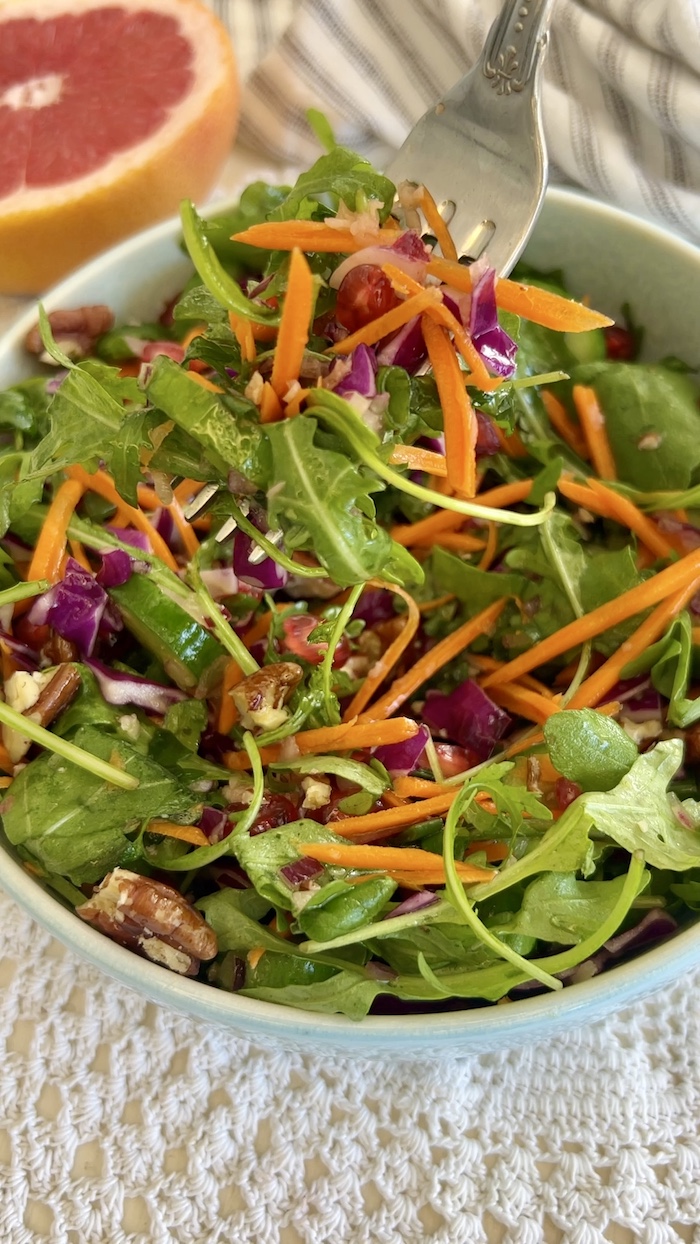 A refreshing winter salad that nourishes from the inside out. Packed with antioxidant-rich ingredients like red cabbage, pomegranate, and grapefruit, this bowl helps support your immune system and gives your skin a natural glow during the colder months. The combination of crispy vegetables, tangy citrus dressing, and crunchy pecans makes every bite vibrant and satisfying. Arugula adds a peppery touch, while fresh ginger and red onion bring warmth and depth to the flavor. It’s light, hydrating, and full of vitamins — the perfect salad to brighten winter days and keep your energy up naturally.