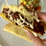 Next, arrange the taco shells in a baking tray and stuff them with the bean filling. Sprinkle some vegan cheese on top and bake at 395 degrees F / 200 degrees C until the cheese has melted.